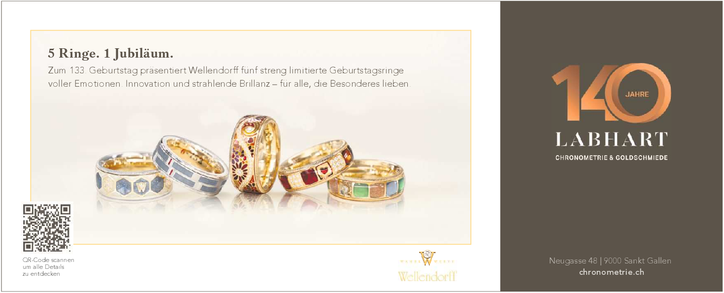 "Ab dem 125. Geburtstag darf man jedes Jahr Jubiläum feiern." Mit diesem augenzwinkernden Motto begann Wellendorff eine einzigartige Tradition: Seit 2018 erscheinenzum Jahresbeginn streng limitierte Geburtstagsringe als Capsule-Kollektion – mutig im Design, stark im Ausdruck und voller Emotion. Zum 133-jährigen Bestehen setzt die Schmuckmanufaktur 2026 ein besonders glanzvolles Zeichen: fünf exklusive Ringe, die nur in diesem Jubiläumsjahr erhältlich sind. Vier Damenringe – "Meine Zeit», "Power of Love", "Flower. Power!" und "Jeder Augenblick" – vereinen 18-karätiges Gold mit neu entwickelten Gravuren, leuchtender Kaltemaille und kunstvoll inszenierten Brillanten. Ergänzt wird die Kollektion durch den eleganten Unisex-Ring 6-752, der zeitlose Klarheit ausstrahlt. Gemeinsam stehen alle fünf Ringe für höchste Goldschmiedekunst, kreative Innovation und die unverwechselbare Handschrift von Wellendorff – seit 133 Jahren. Für weitere Informationen steht die Labhart-Goldschmiede gerne zur Verfügung. (vred)